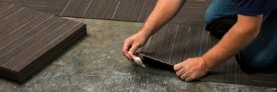 Tactiles spread adhesive and floor prep products for installing interface carpet tile.